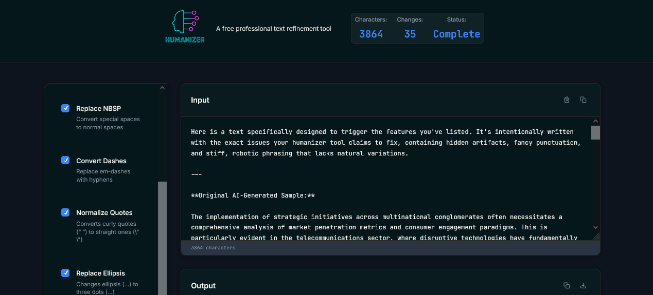 A client-side text refinement tool that converts AI-generated content into natural human writing with full privacy by processing entirely in-browser.