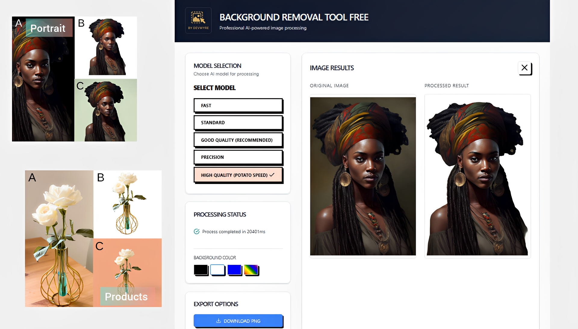 Browser-based background removal tool that processes images locally without server uploads, ensuring privacy while providing professional editing capabilities.